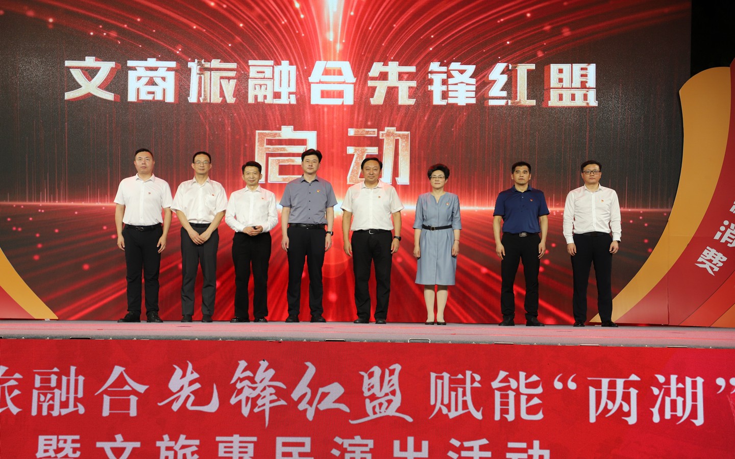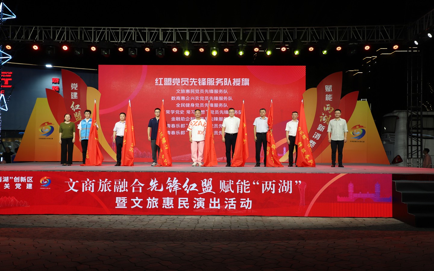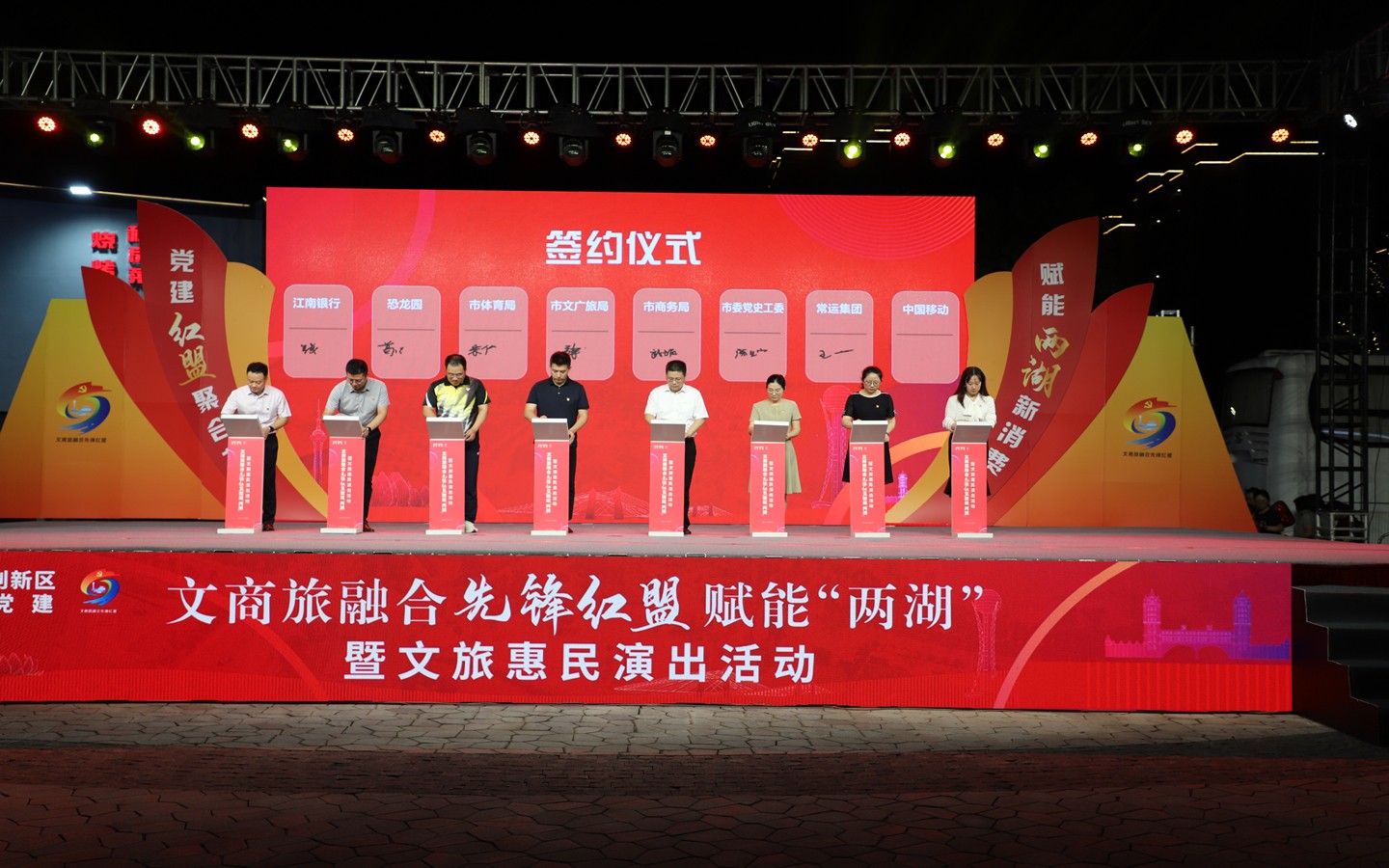 9月13日晚,“黨建紅盟聚合力、賦能兩湖新消費”文商旅融合先鋒紅盟賦能“兩湖”暨文旅惠民演出活動在藍海豚文化藝術(shù)街區(qū)成功舉行。市級機關(guān)工委書記趙天晟,副書記潘奕,市文廣旅局黨組書記、局長嚴俊,市商務(wù)局黨組書記、局長韓雪琴,市黨史工委主任柯善學(xué)等領(lǐng)導(dǎo)出席活動;金壇、武進、鐘樓區(qū)文旅(體育)、商務(wù)、黨史部門領(lǐng)導(dǎo)及恐龍園、江南銀行、常州移動等紅盟單位重點企業(yè)領(lǐng)導(dǎo)參加活動。集團公司黨委書記、總經(jīng)理朱平春、副總經(jīng)理黃細富等領(lǐng)導(dǎo)及街區(qū)商管公司相關(guān)人員參加活動。